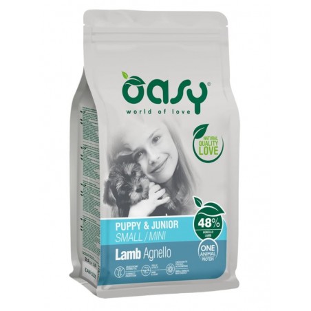 Oasy Puppy & Junior S/Mini Jagnięcina to kompletna karma dla psów szczeniąt małych ras (do 12 miesiąca życia). W swoim składzie zawiera wyłącznie jedno źródło białka zwierzęcego - jagnięcinę. Karma jest znakomita dla psów z nietolerancją pokarmową, problemami skórnymi lub nadwrażliwością jelit. Inulina jest naturalnym źródłem prebiotyku FOS (fruktooligosacharydów), który wraz z MOS (oligosacharydy mannanowe) sprzyja prawidłowej równowadze flory bakteryjnej jelit. Ekstrakt z juki pomaga kontrolować zapach odchodów psa. Pulpa buraczana jest doskonałym źródłem błonnika i wspomaga regularną pracę jelit.