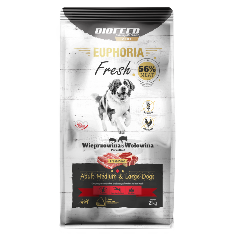 Biofeed Euphoria Fresh Meat Adult Wieprzowina Wołowina to bezglutenowa sucha karma specjalnie zaprojektowana dla dorosłych psów ras średnich i dużych. Unikalne połączenie świeżej wieprzowiny i suszonej wołowiny stanowi źródło wysoko strawnego białka pochodzenia zwierzęcego. Idealna dla psów o wrażliwym układzie pokarmowym oraz tych wymagających zbilansowanej codziennej diety.