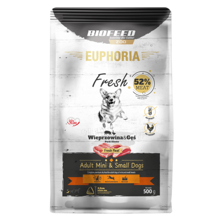 Biofeed Euphoria Fresh Meat Adult Wieprzowina Gęś to bezglutenowa sucha karma specjalnie zaprojektowana dla dorosłych psów ras małych i miniaturowych. Unikalne połączenie świeżej wieprzowiny i suszonej gęsiny stanowi źródło wysoko strawnego białka pochodzenia zwierzęcego. Idealna dla psów o wrażliwym układzie pokarmowym oraz tych wymagających zbilansowanej codziennej diety.