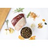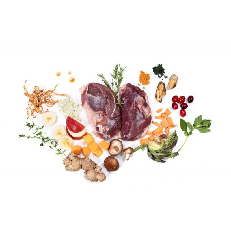 Skład: 75% świeże mięso z kaczki, 20% bataty, 3% mieszanka zdrowotna: (banan (5982 mg/kg), karczoch (4486 mg/kg), cykoria (4813 mg/kg), lucerna (2393 mg/kg), jabłka (2094 mg/kg), dynia (1794 mg/kg), żurawina (1495 mg/kg), małża zielonowargowa (1346 mg/kg), zielona herbata (1196 mg/kg), rozmaryn (1047 mg/kg) , tymianek (897 mg/kg) oregano (748 mg/kg), ostropest plamisty (269 mg/kg), spirulina (239 mg/kg), oliwa z oliwek (209 mg/kg), juka, kordyceps (179 mg/kg ), shiitake, mniszek lekarski, imbir, kurkuma), 1% olej z pstrąga, glukozamina (1000 mg/kg), chondroityna (850 mg/kg), MSM (650 mg/kg).