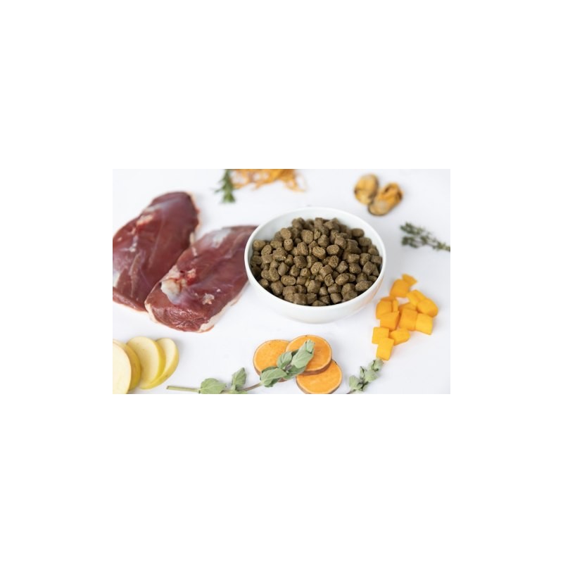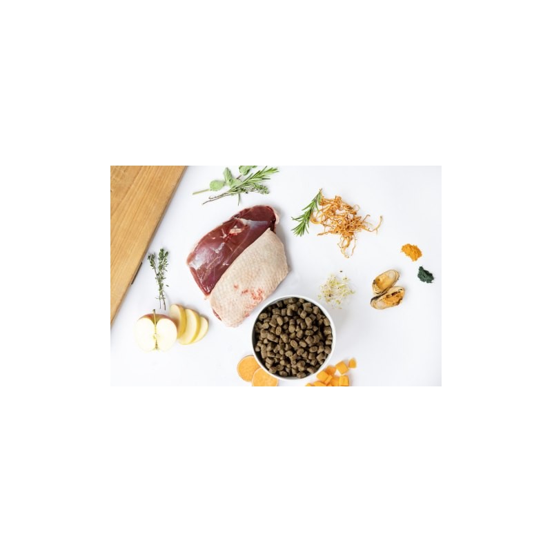 Skład: 75% świeże mięso z kaczki, 20% bataty, 3% mieszanka zdrowotna: (banan (5982 mg/kg), karczoch (4486 mg/kg), cykoria (4813 mg/kg), lucerna (2393 mg/kg), jabłka (2094 mg/kg), dynia (1794 mg/kg), żurawina (1495 mg/kg), małża zielonowargowa (1346 mg/kg), zielona herbata (1196 mg/kg), rozmaryn (1047 mg/kg) , tymianek (897 mg/kg) oregano (748 mg/kg), ostropest plamisty (269 mg/kg), spirulina (239 mg/kg), oliwa z oliwek (209 mg/kg), juka, kordyceps (179 mg/kg ), shiitake, mniszek lekarski, imbir, kurkuma), 1% olej z pstrąga, glukozamina (1000 mg/kg), chondroityna (850 mg/kg), MSM (650 mg/kg).