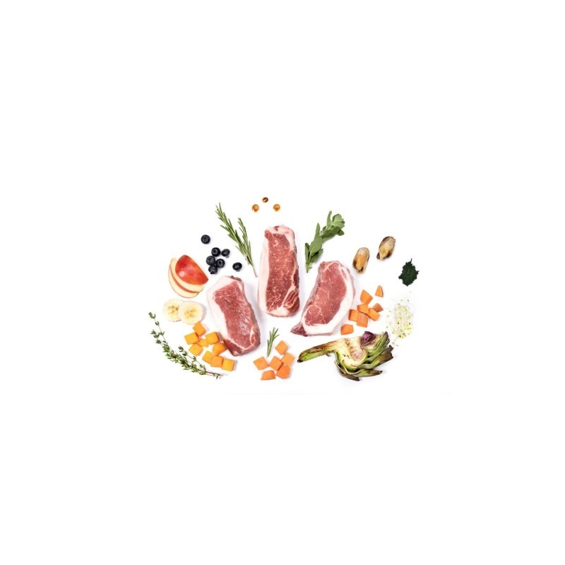 Skład: 75% świeżej wieprzowiny Iberico, 20% batatów, 3% mieszanki zdrowotnej: (banan (5982 mg/kg), karczoch (5085 mg/kg), cykoria, lucerna (2991 mg/kg), jabłka (2692 mg/kg), dynia (2393 mg/kg), jagody (2094 mg/kg), małża zielonowargowa (1196 mg/kg), rozmaryn (897 mg/kg), tymianek (598 mg/kg), oregano (449 mg/kg), ostropest plamisty, spirulina (239 mg/kg), oliwa z oliwek, juka), 1% olej z pstrąga, glukozamina (1000 mg/kg), chondroityna (850 mg/kg), MSM (650 mg/kg).