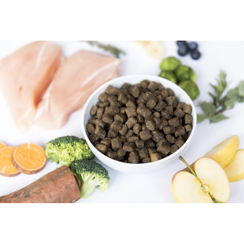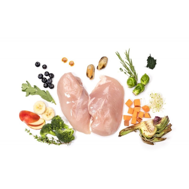 Skład: 75% świeżego mięsa i ryb (45% kurczaka, 15% sardynek, 15% anchois), 20% batatów, 3% mieszanki zdrowotnej (banan (4487 mg/kg), karczoch (4188 mg/kg), cykoria, lucerna (2991 mg/kg), jabłka (2692 mg/kg), brokuły (2542 mg/kg), borówki amerykańskie (2393 mg/kg), kiełki (2094 mg/kg), małża zielonowargowa (1496 mg/kg), rozmaryn (1196 mg/kg), tymianek (897 mg/kg), oregano (598 mg/kg), ostropest plamisty, spirulina, oliwa z oliwek, juka), 1% olej z pstrąga, glukozamina (1000 mg/kg), chondroityna ( 850 mg/kg), MSM (650 mg/kg).