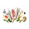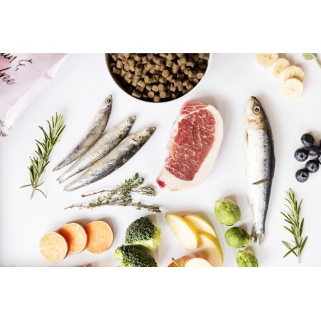 Skład: 75% świeżego mięsa i ryb morskich (45% mięsa wieprzowiny Iberico, 15% sardynek, 15% anchois), 20% batatów, 3% mieszanki zdrowotnej: (banan (5982 mg/kg), karczoch (4487 mg/kg), cykoria, lucerna (2692 mg/kg), jabłka (2542 mg/kg), brokuły, jagody (2333 mg/kg), brukselka (2303 mg/kg), małża zielonowargowa (598 mg/kg), rozmaryn ( 419 mg/kg), tymianek (389 mg/kg), oregano (359 mg/kg), ostropest plamisty, spirulina (242 mg/kg), oliwa z oliwek, juka), olej z pstrąga 1%, glukozamina (1000 mg/kg) ), chondroityna (850 mg/kg), MSM (650 mg/kg)