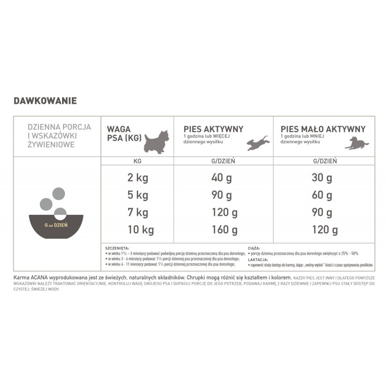 Oparta na naturalnych składnikach, pełnowartościowa i zbilansowana sucha karma dla psów dorosłych małych ras. Acana Adult Small jest bezzbożowa i zawiera wysokiej jakości białko pochodzące od kurczaka z chowu bezklatkowego.
