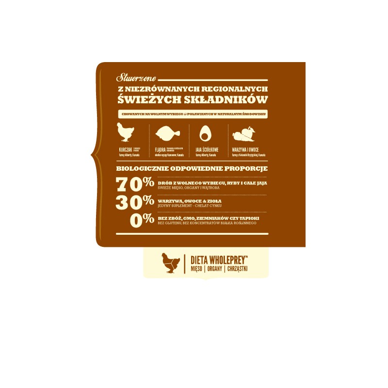 Skład: Świeże mięso kurczaka (22%), dehydratyzowany kurczak (21%), cała czerwona soczewica, cały groch zielony, świeże organy kurczaka (wątroba, serce) (6%), dehydratyzowany śledź (4%), jaja (4%), surowa flądra (4%), olej rybny (4%), cała ciecierzyca, włókno grochu, skrobia grochowa, dehydratyzowany indyk (2,5%), cała zielona soczewica, cały groch żółty, tłuszcz z kurczaka (2%), surowa wątroba indyka (0,5%), sól, suszony kelp, świeże całe jabłka, świeża cała dynia piżmowa, świeża cała marchew, świeże całe gruszki, świeża cała dynia, świeża cała cukinia, świeży jarmuż, świeży szpinak, świeże liście rzepy, świeże liście buraków, świeże całe borówki, świeża cała żurawina, świeże całe jagody saskatoon, korzeń łopianu, lawenda, korzeń prawoślazu lekarskiego, ostropest plamisty, owoce dzikiej róży, kurkuma.