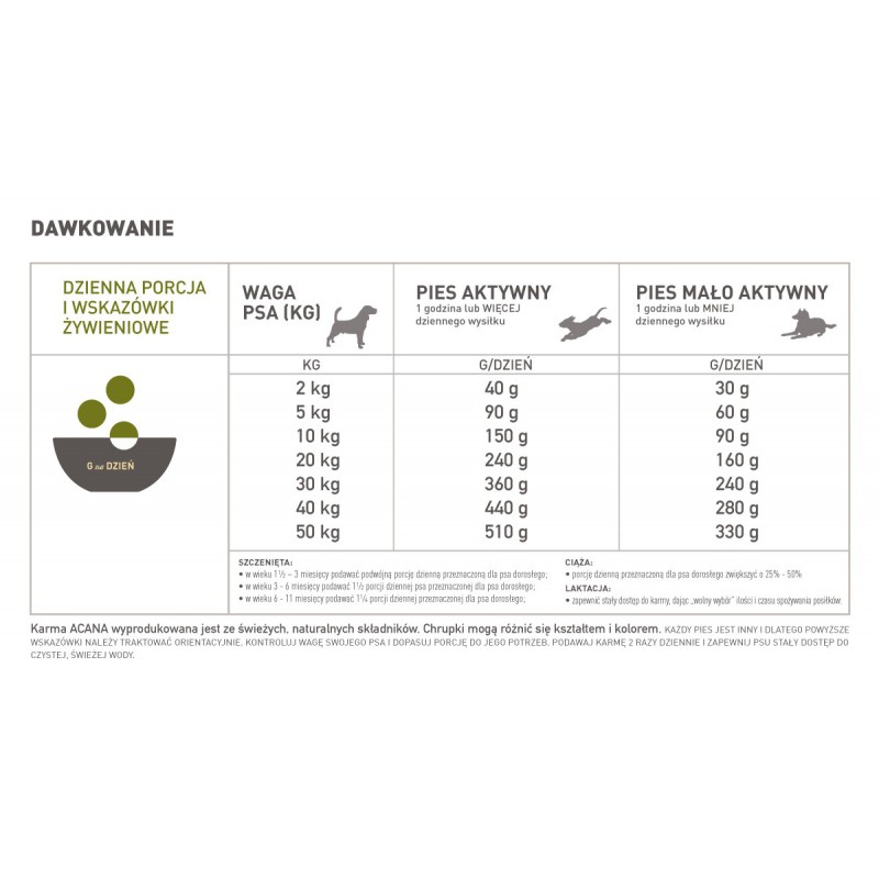 Acana Grasslands przepełnione jest jagnięciną, kaczką z wolnego wybiegu oraz rybami poławianymi w naturalnym środowisku. Mięso dostarczane jest do naszej kuchni świeże lub surowe, bogate w składniki odżywcze i pełne doskonałego smaku. Jedzenie ACANA nie zawiera wysokoglikemicznych zbóż, cechuje się wysoką zawartością białka zwierzęcego i kwasów omega-3, które gwarantują szczytową formę twojego psa.