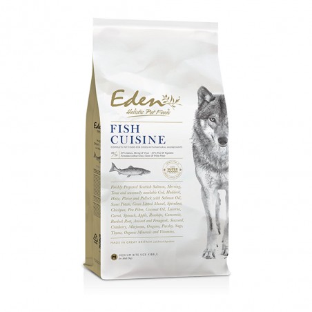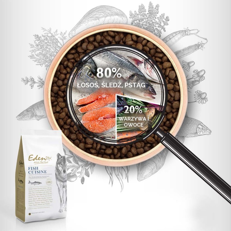 Karma dla psa Eden Fish Szkocki Łosoś i Śledź Północnoatlantycki jest tworzona wyłącznie z najlepszych rybnych składników: szkockiego łososia, śledzia północnoatlantyckiego oraz sezonowo dostępnych ryb – dorsza, plamiaka, morszczuka, mintaja i gładzicy.