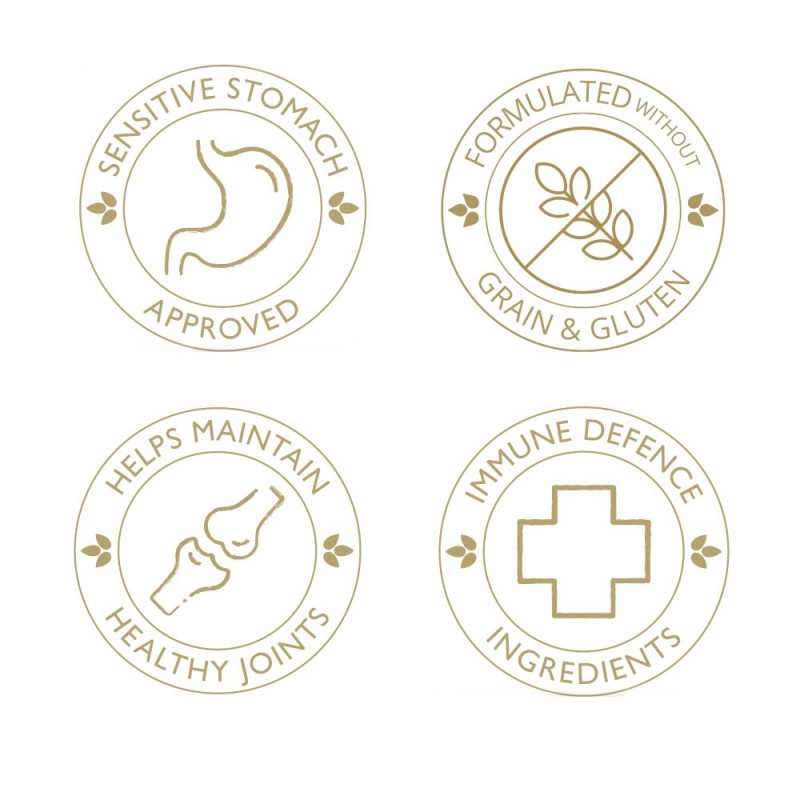 Skład: Łosoś 23%, suszony śledź 21,5%, bataty 13%, suszone ryby 8% (w zależności od „połowu dnia” może zawierać dorsza, plamiaka, morszczuka, mintaja lub gładzicę), suszony łosoś 8%, pstrąg 6%, biała ryba 6%, olej z łososia 6%, włókna groszkowe, bulion z łososia 1,5%, lucerna, ciecierzyca, olej kokosowy 0,5%, szpinak, marchewka, jabłka, zielone małże 0,1%, spirulina 0,1%, owoc róży, suszony korzeń łopianu, rumianek, anyż, kozieradka, algi, majeranek, oregano, pietruszka, szałwia, tymianek, witaminy i minerały, Fruktooligosacharydy (960 mg/kg), glukozamina (340 mg/kg), MSM (340 mg/kg), siarczan chondroityny (240 mg/kg), Mannaoligosacharydy (240mg/kg).