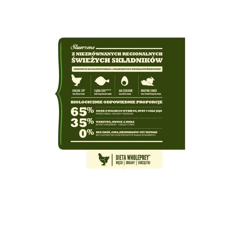 Skład: Świeże mięso kurczaka (19%), dehydratyzowany kurczak (18,5%), cała czerwona soczewica, cały groch zielony, dehydratyzowany indyk (6%), świeże organy kurczaka (wątroba, serce) (5%), dehydratyzowany śledź (4%), włókno grochu, jaja (4%), surowa flądra (4%), olej rybny (3%), cała ciecierzyca, cała zielona soczewica, cały groch żółty, skrobia grochowa, tłuszcz z kurczaka (1%), surowa wątroba indyka (0,5%), suszony kelp, świeża cała dynia, świeża cała dynia piżmowa, świeża cała marchew, świeże całe jabłka, świeże całe gruszki, świeża cała cukinia, suszony korzeń cykorii, świeży jarmuż, świeży szpinak, świeże liście rzepy, świeże liście buraków, świeża cała żurawina, świeże całe borówki, świeże całe jagody saskatoon, kurkuma, ostropest plamisty, korzeń łopianu, lawenda, korzeń prawoślazu lekarskiego, owoce dzikiej róży.