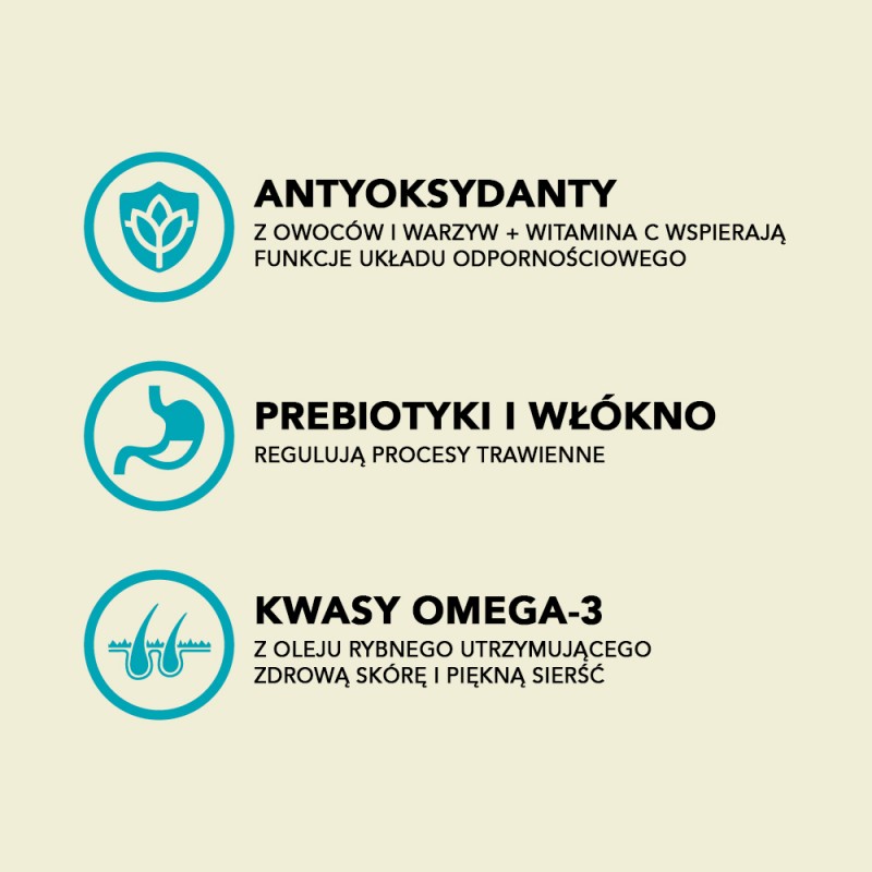 Skład: Dehydratyzowany śledź (21%), owies bezłuskowy (21%), surowy cały śledź (10%), surowy cały morszczuk północnopacyficzny (8%), olej rybny (6%), tłuszcz wieprzowy (5%), cała czerwona soczewica, cały owies (4%), cały groch, cała zielona soczewica, skrobia grochowa, cała ciecierzyca, lucerna, włókno soczewicy, węglan wapnia, suszony kelp, świeża cała dynia, świeża cała dynia piżmowa, świeża cała marchew, świeże całe jabłka, świeże całe gruszki, świeża cała cukinia, suszony korzeń cykorii, świeży jarmuż, świeży szpinak, świeże liście rzepy, świeże liście buraków, cała żurawina, całe borówki, całe jagody saskatoon, kurkuma, ostropest plamisty, korzeń łopianu, lawenda, korzeń prawoślazu lekarskiego, owoce dzikiej róży.