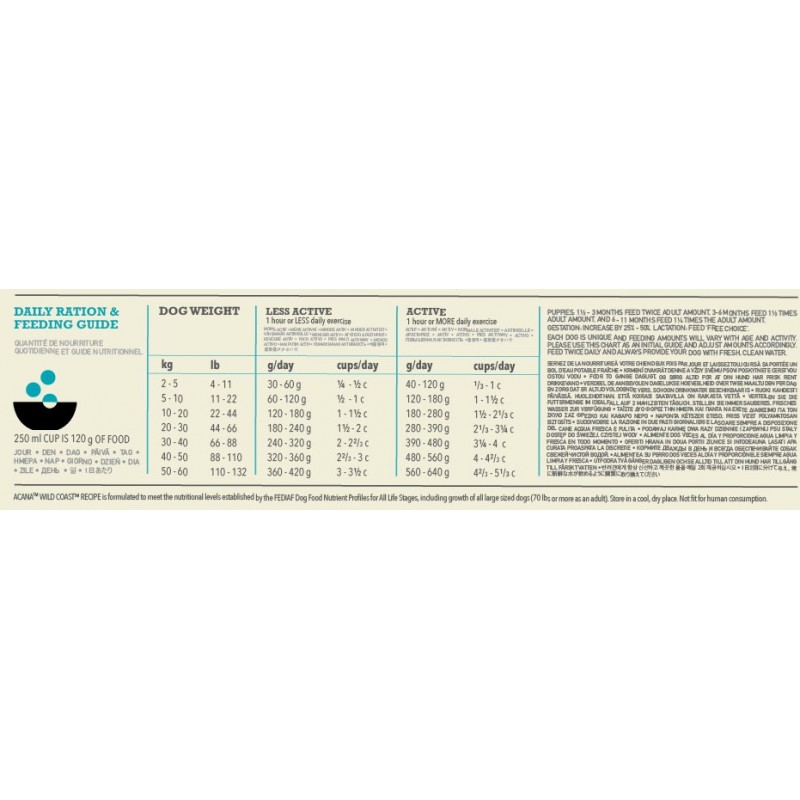 Oparta na naturalnych składnikach, pełnowartościowa i zbilansowana sucha karma dla psów starszych wszystkich ras. Acana Wild Coast jest bezzbożowa i zawiera wysokiej jakości białko pochodzące z mięsa ryb poławianych w naturalnym środowisku z okolic wyspy Vancouver.