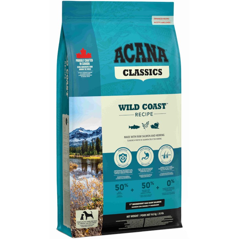 Acana Wild Coast to karma naturalna dla psów,na każdym etapie życia- karma z rybami: śledź, stornia, morszczuk. Podając produkty z serii Acana Classic masz pewność, że Twój ukochany czworonóg otrzymuje pełnowartościowy posiłek najwyższej jakości z bogatą zawartością mięsa ryb , ponieważ pies jest carnivore tzn musi dostawać mięso i tym modelem żywieniowym kieruje się Acana