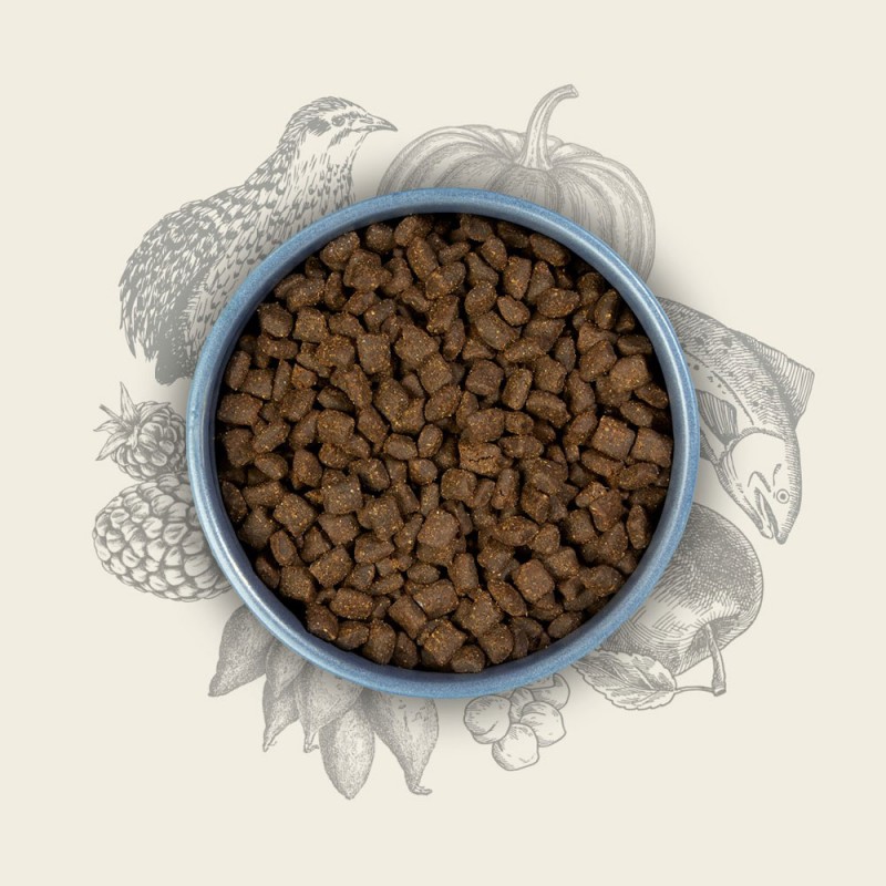 Skład: 26% suszony łosoś, 21% przepiórka (mrożona), gliceryna roślinna, słodkie ziemniaki, 6% tłuszcz wieprzowy, 5% dziczyzna(mrożona), lucerna, 2% wątróbka wieprzowa (mrożona), tapioka, ciecierzyca, dynia, jabłko, jeżyna, seler, cykoria, 0,03% glukozamina,0,033% metylosulfonylometan (MSM), 0,02% siarczan chondroityny.