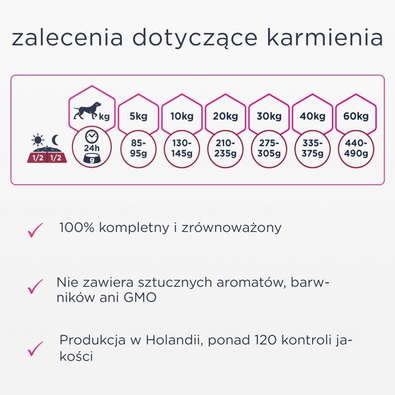 Skład analityczny: Białko: 24,0%, Zawartość tłuszczu: 12,0%, Kwasy tłuszczowe omega-6: 1,7%, Kwasy tłuszczowe omega-3: 1,2%, Popiół surowy: 6,9%, Włókno surowe: 2,4%, Wapń: 1,2%, Fosfor: 0,9%.