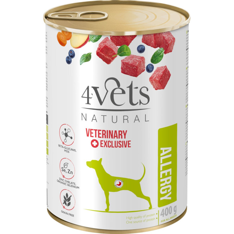 4Vets Natural Dog Allergy to specjalistyczna karma weterynaryjna posiadająca w swoim składzie wyłącznie jedno źródło białka o niskim potencjale uczulającym. Dodatkowo zawiera podwyższoną ilość kwasów omega-3 oraz omega-6, przez co wpływa na zmniejszenie ryzyka wystąpienia stanów zapalnych przewodu pokarmowego oraz pomaga w ewentualnym ich leczeniu.