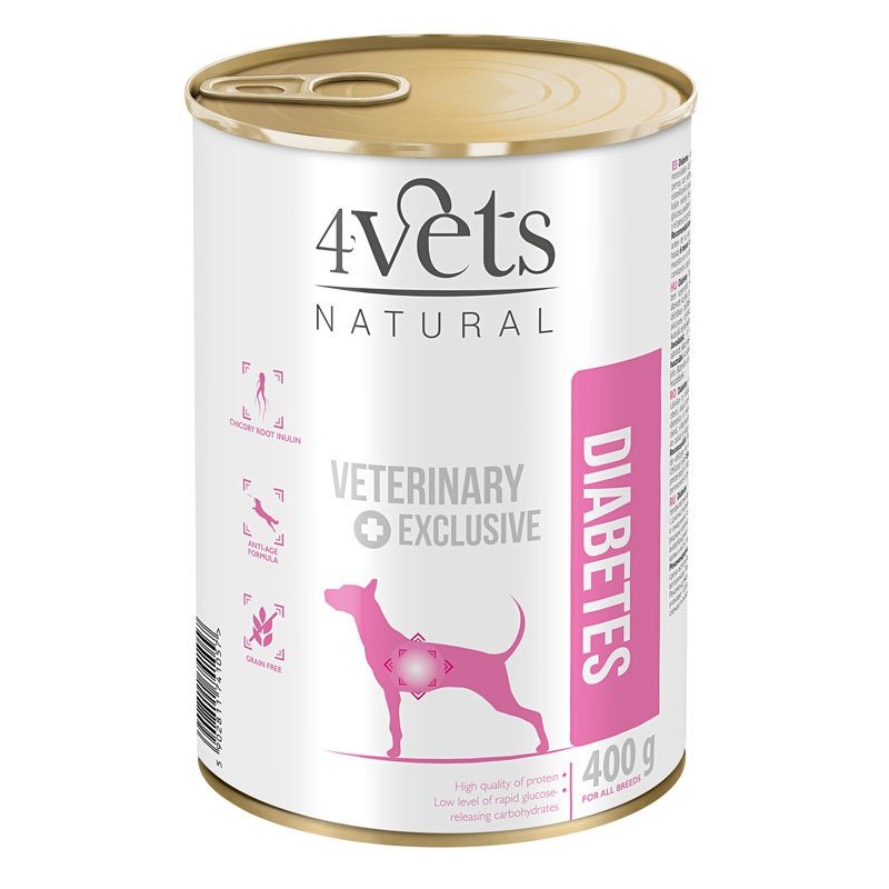 4Vets Natural Diabetes to wysokiej jakości dietetyczna karma dla psów chorujących na cukrzycę. Może służyć jako karma pełnoporcjowa w przypadku potwierdzonej choroby, ale także może być podawana profilaktycznie psom z nadwagą i otyłością, a także po sterylizacji i kastracji.