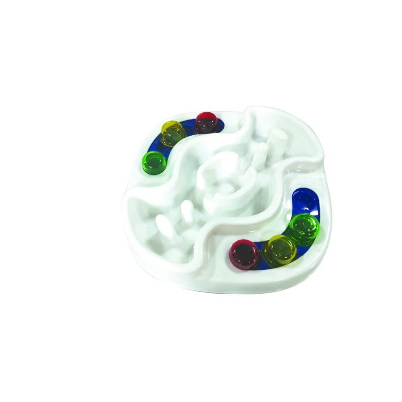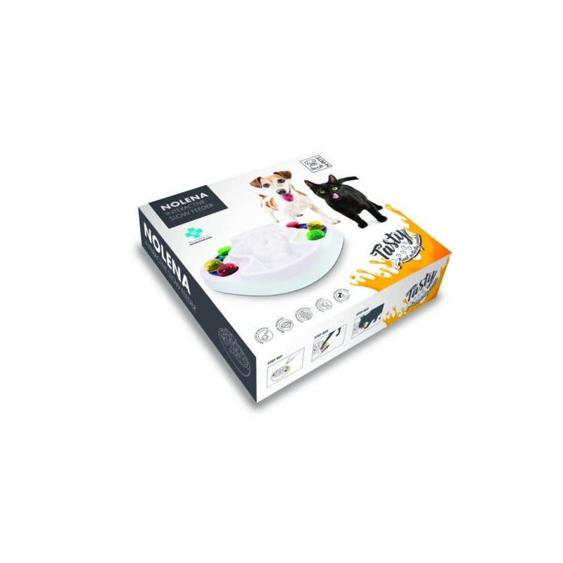 Interaktywna miska łączy zabawę i funkcję edukacyjną. Można ją wypełnić smakołykami, karmą suchą lub mokrą. Jest odpowiednia dla zwierząt w każdym wieku
