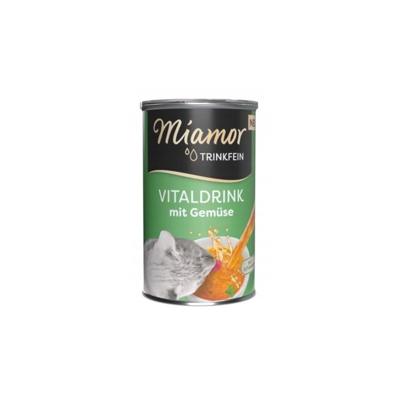 Miamor VitalDrink Gemuse to karma uzupełniająca w formie zupy z kawałkami mięsa. Koty, które nie przyjmują wystarczającej ilości płynów są bardziej podatne na kamienie moczowe (dotyczy to zwłaszcza zwierząt spożywających suchą karmę). Zawiera cenne minerały i białka.