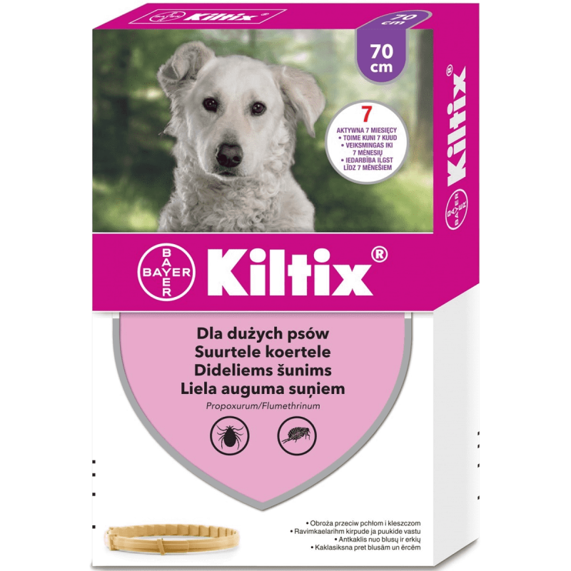 Obroża powinna być noszona stale z wyjątkiem kąpieli. Można ją założyć ponownie gdy sierść wyschnie. W pojedynczych przypadkach w czasie noszenia obroży możliwa jest inwazja kleszczy, które odpadają najpóźniej po trzech dniach bez ssania krwi. Obroża Kiltix przeznaczona jest wyłącznie do stosowania zewnętrznego.