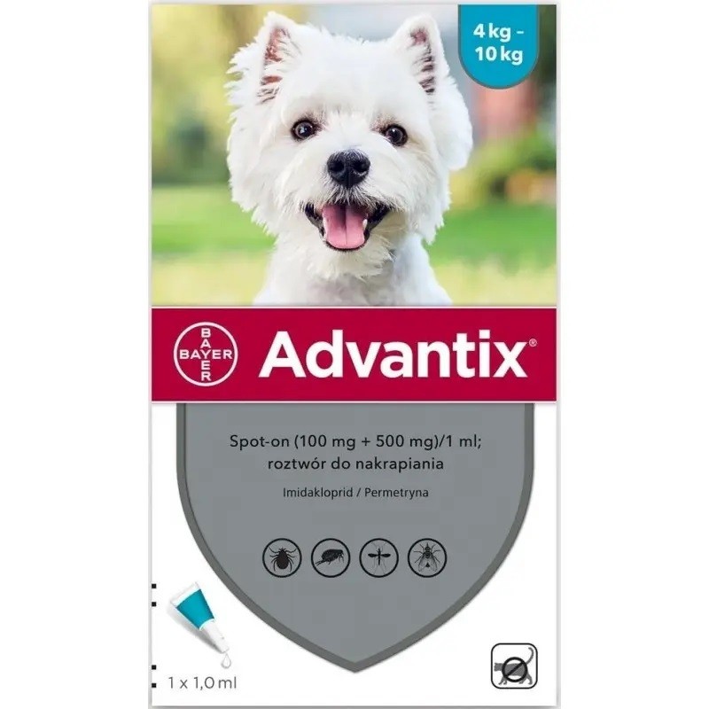 Bayer Advantix Spot-on to zaawansowany preparat na pchły i kleszcze w postaci wygodnych w użyciu kropelek, który skutecznie zwalcza pasożyty u psów, a także zapobiega ich ponownemu pojawieniu się. Środek dedykowany jest psom o wadze od 4kg do 10kg.