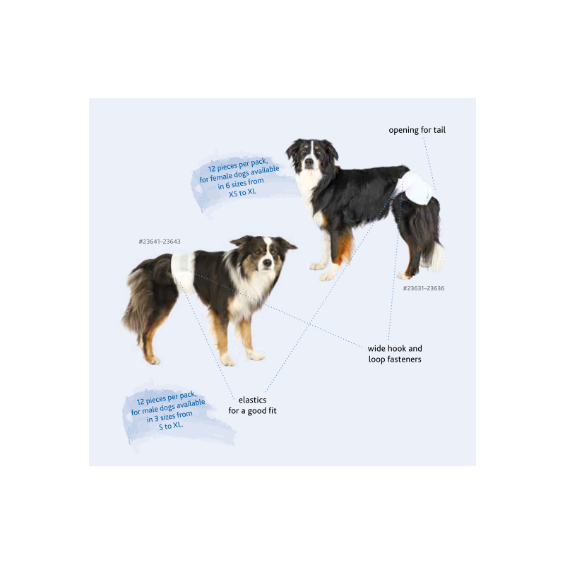 Dopasowane pieluchy dla psów (samców) zapinane na wygodny rzep. Łatwe do zakładania, komfortowe dla psa. Idealne w przypadku psów seniorów, psów nietrzymających moczu, dla psów z chronicznymi stanami zapalnymi układu moczowo-płciowego oraz psów, które niewłaściwie się zachowują i nadmiernie znakują teren (podsikują).