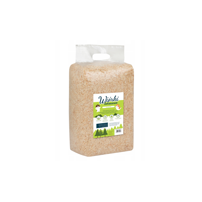 Wiórki luksusowe są duże, cienkie i zakręcone jak świńskie ogonki. Są miękkie i delikatne – idealne dla wrażliwych stópek zwierzaków. Nie znajdziesz w nich kurzu, ani drobnych wiórów, ponieważ poza odpylaniem, nasze wiórki są też odsiewane na sitach. Opakowanie ma wygodne ucho, a same wiórki są delikatnie sprasowane, dzięki czemu nie zajmują dużo miejsca i dalej swobodnie można je wysypać