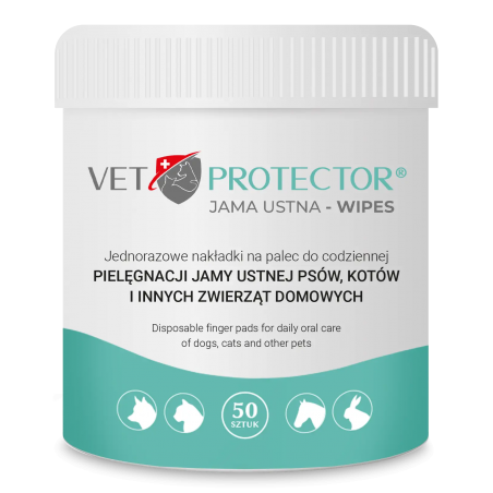 VET PROTECTOR® JAMA USTNA – WIPES to praktyczne nakładki na palec do higieny jamy ustnej psa i kota, które umożliwiają szybkie i dokładne czyszczenie zębów oraz dziąseł. Każda chusteczka nasączona jest starannie dobraną formułą składników aktywnych, które wspierają usuwanie płytki nazębnej, osadu oraz innych zanieczyszczeń z jamy ustnej. Regularne stosowanie pomaga utrzymać świeży oddech, zdrowe dziąsła i czyste zęby u psów, kotów oraz innych małych zwierząt domowych.
