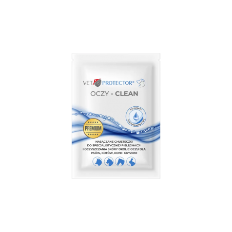 VET PROTECTOR® OCZY CLEAN to nasączane chusteczki do specjalistycznej pielęgnacji i oczyszczania skóry okolic oczu. VET PROTECTOR® OCZY – CLEAN usuwa zalegające na powiekach i brzegach powiek zanieczyszczenia oraz wydzielinę. Pielęgnuje skórę powiek i wspiera procesy regeneracyjne, a także zapewnia redukcję przebarwień i zacieków łzowych.