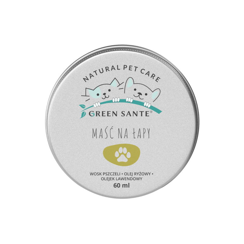 Naturalna maść́ pielęgnacyjno-ochronna na łapy dla psów i kotów GREEN SANTE® zapewni Twojemu pupilowi kompleksową ochronę̨ i regenerację delikatnej skóry na łapkach niezależnie od pory roku. Starannie wyselekcjonowane naturalne składniki działają̨ regenerująco, odżywczo i nawilżająco na delikatną skorę łap, tworząc ochronną warstwę̨ lipidową, chroniącą przed negatywnymi wpływami czynników zewnętrznych. Produkt sprawdzi się̨ niezależnie od pory roku – latem ochroni przed oparzeniami i wysokimi temperaturami asfaltu lub piasku, a zimą przed mrozem, lodem i śniegiem oraz wpływem soli.