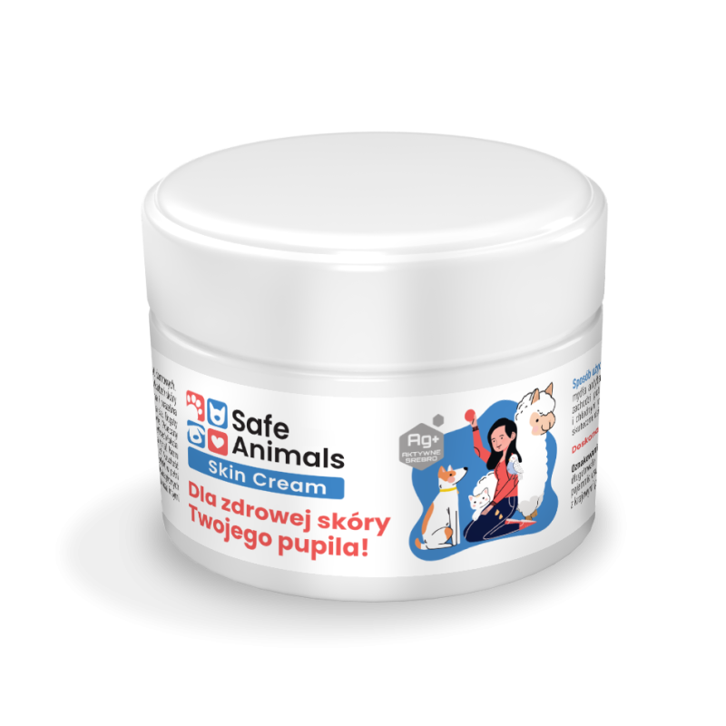 Safe Animals Skin Cream to idealny krem do pielęgnacji skóry zwierząt domowych. Zawarte w składzie aktywne formy srebra wspomagają gojenie się zmian i uszkodzeń skóry zapewniając długotrwałą ochronę. Specjalnie dobrana w składzie lanolina i wazelina łagodzą podrażnienia suchej i popękanej skóry, eliminując efekt łuszczenia się. Bogaty skład kremu gwarantuje skuteczną regenerację skóry i jej uelastycznienie.