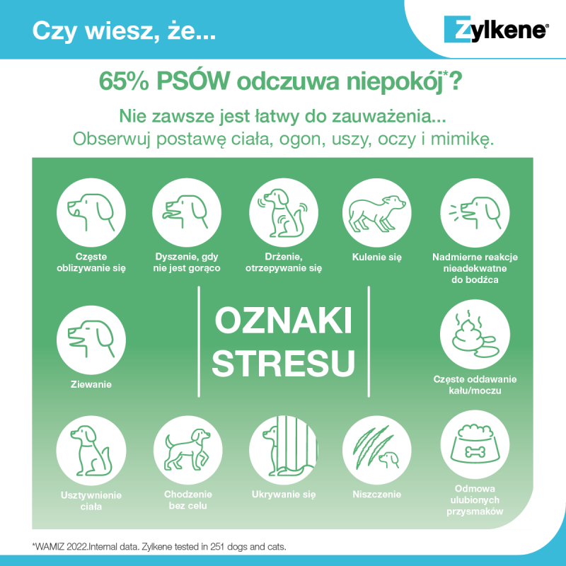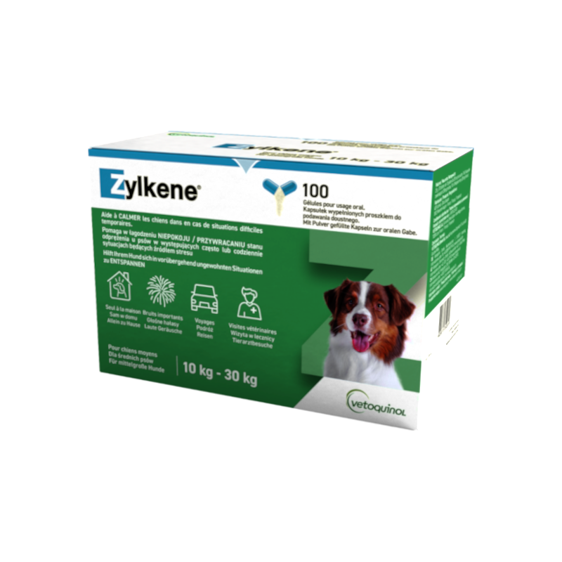 Vetoquinol Zylkene to innowacyjny suplement diety dla psów o masie ciała od 10 do 30 kg, wspierający radzenie sobie ze stresem i lękiem. Produkt bazuje na naturalnym składniku – α-kazozepinie, pochodnej białka mleka, która wykazuje działanie relaksujące i uspokajające bez efektu otępienia. Dzięki temu Zylkene pomaga pupilom zachować spokój w trudnych sytuacjach, takich jak zmiana otoczenia, podróże, wizyty u weterynarza czy głośne dźwięki (np. burze, fajerwerki).