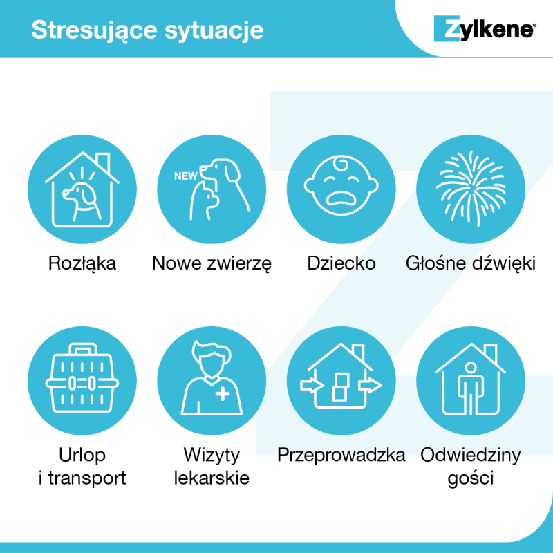 zdarzeniem takim jak zmiana otoczenia, pozostawienie samemu, przeprowadzka do nowego domu, pojawienie się nowych osób lub zwierząt, odsadzanie, podróż,