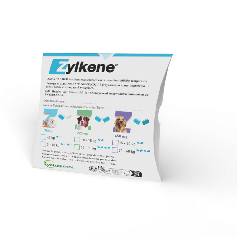 STOSOWANIE: kapsułki Zylkene® zawierają składnik naturalnego pochodzenia o potwierdzonym działaniu polegającym na łagodzeniu niepokoju / przywracaniu