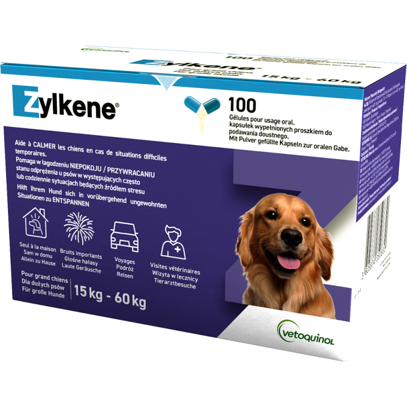 Vetoquinol Zylkene to innowacyjny suplement diety dla psów o masie ciała od 15 do 60 kg, wspierający radzenie sobie ze stresem i lękiem. Produkt bazuje na naturalnym składniku – α-kazozepinie, pochodnej białka mleka, która wykazuje działanie relaksujące i uspokajające bez efektu otępienia. Dzięki temu Zylkene pomaga pupilom zachować spokój w trudnych sytuacjach, takich jak zmiana otoczenia, podróże, wizyty u weterynarza czy głośne dźwięki (np. burze, fajerwerki).