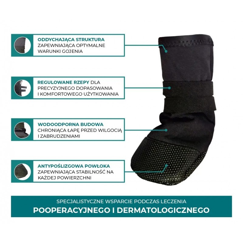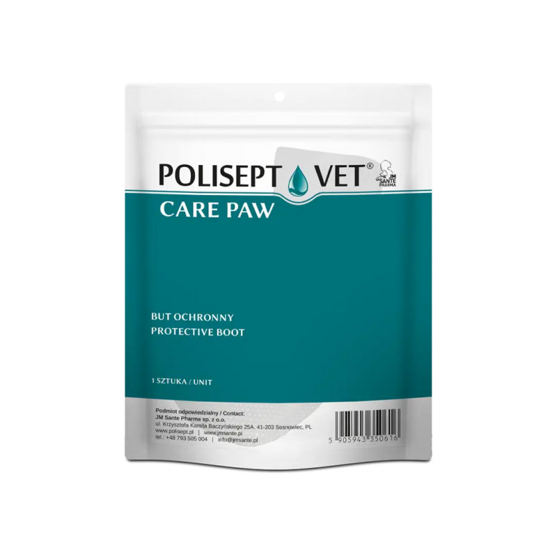 POLISEPT VET® CARE PAW to specjalistyczny opatrunek w formie wygodnego buta, który chroni delikatne tkanki łap podczas leczenia i gojenia ran.