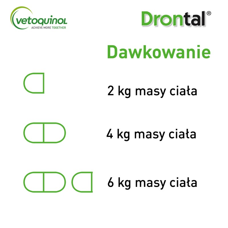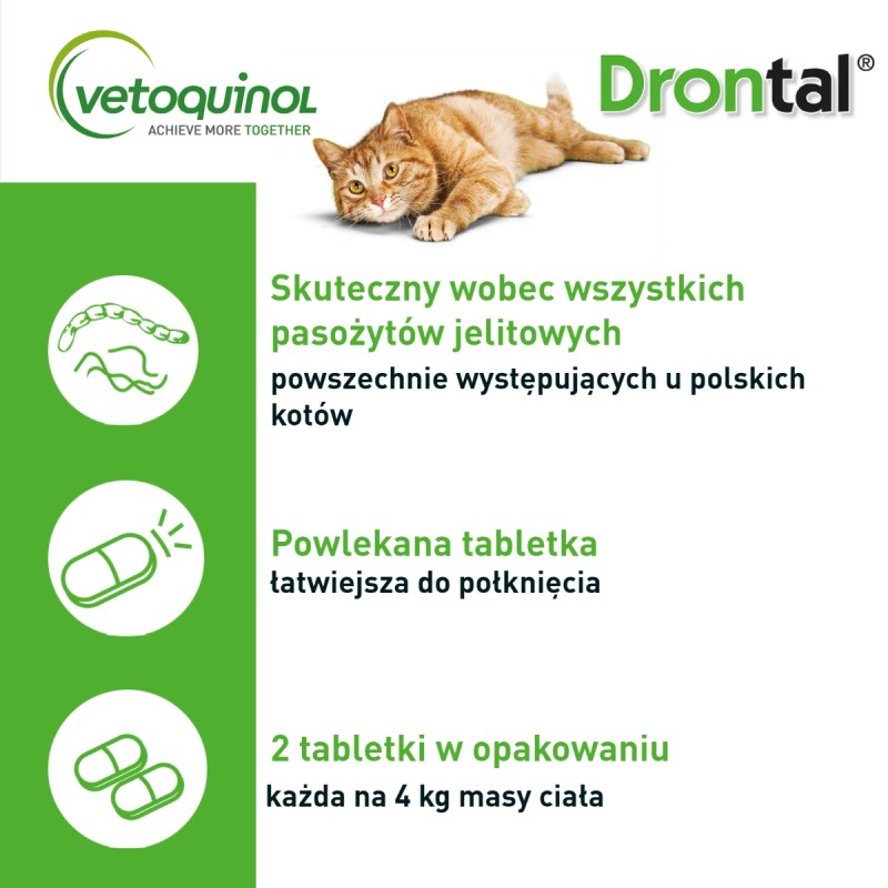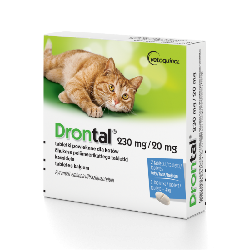Drontal, 230 mg/20 mg tabletki powlekane dla kotów • Jedna tabletka zawiera: pyrantelu embonian 230 mg; prazikwantel 20 mg • Wskazania lecznicze: Zwalczanie inwazji nicieni i tasiemców przewodu pokarmowego kotów, takich jak: Toxocara cati, Ancylostoma tubaeforme, Ancylostoma braziliense, Echinococcus multilocularis, Dipylidium caninum, Taenia taenieformis, Mesocestoides spp., Joyeuxiella spp. • Przeciwwskazania: Nie stosować u kociąt przed ukończeniem trzeciego tygodnia życia. Nie stosować u kotek w pierwszych dwóch trymestrach ciąży. • Podmiot odpowiedzialny: Vetoquinol S.A., Francja • Przed użyciem zapoznaj się z treścią ulotki dołączonej do opakowania.