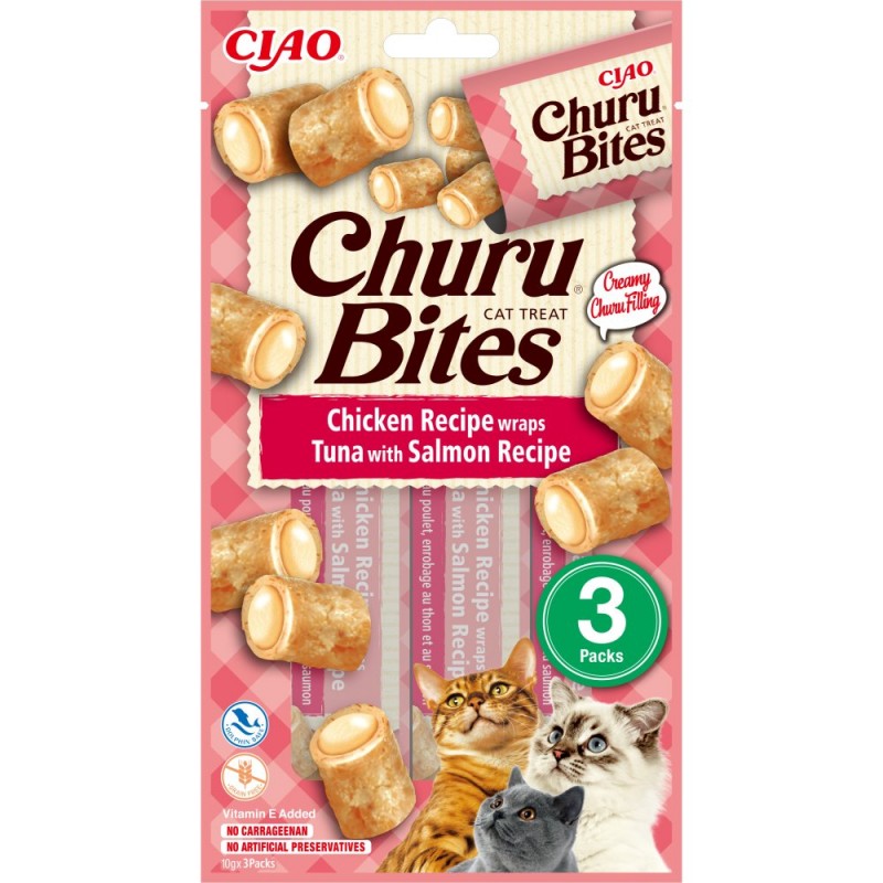 Inaba Churu Bites Cat to rozpływające się w pyszczku smaczki, przypominające małe poduszeczki. Miękka, pieczona pasta z kurczaka na zewnątrz, wypełniona delikatnym kremem o smaku tuńczyka i łososia. Mięso pozyskiwane do produkcji Churu pochodzi od kur z wolnego wybiegu oraz tuńczyka dalekomorskiego (poławianego w sposób bezpieczny dla delfinów). W ich składzie nie znajdziemy konserwantów, sztucznych barwników i zbóż, będących często przyczyną nieprzyjemnych alergii lub nietolerancji pokarmowej. Dodatkowo zawierają ekstrakt z zielonej herbaty oraz witaminę E. Smaczki można stosować jako nagrodę lub przekąskę między posiłkami, a jeżeli Twój pupil ma problem z przyjmowaniem leków, można w nich ukryć tabletkę. Produkt został zapakowany w trzy osobne saszetki, wszystko po to aby zachować świeżość na długi czas.