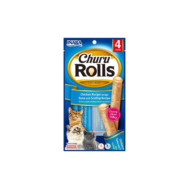 Inaba Churu Rolls to miękkie, naturalne i bezzbożowe przysmaki z kurczaka w kształcie patyczka. W swoim składzie nie zawierają konserwantów oraz sztucznych barwników. Każde opakowanie zawiera cztery osobne opakowania przysmaków, aby zachować maksymalną świeżość.