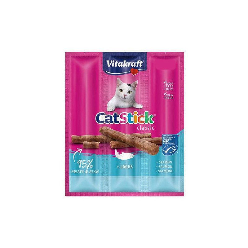 Vitakraft CatStick to znakomita przekąska w formie miękkich kabanosów dla kotów wszystkich ras. Dzięki zawartości aż 75% mięsa w składzie pokochają go najwybredniejsi smakosze. Każdy paluszek posiada rowki, dzięki bez trudu można połamać na mniejsze porcje lub włożyć w nie lekarstwa, aby zwierzak nie kaprysił podczas połykania. Przysmaki Vitakraft wspaniale pachną i smakują, a Twój pupil je pokocha.