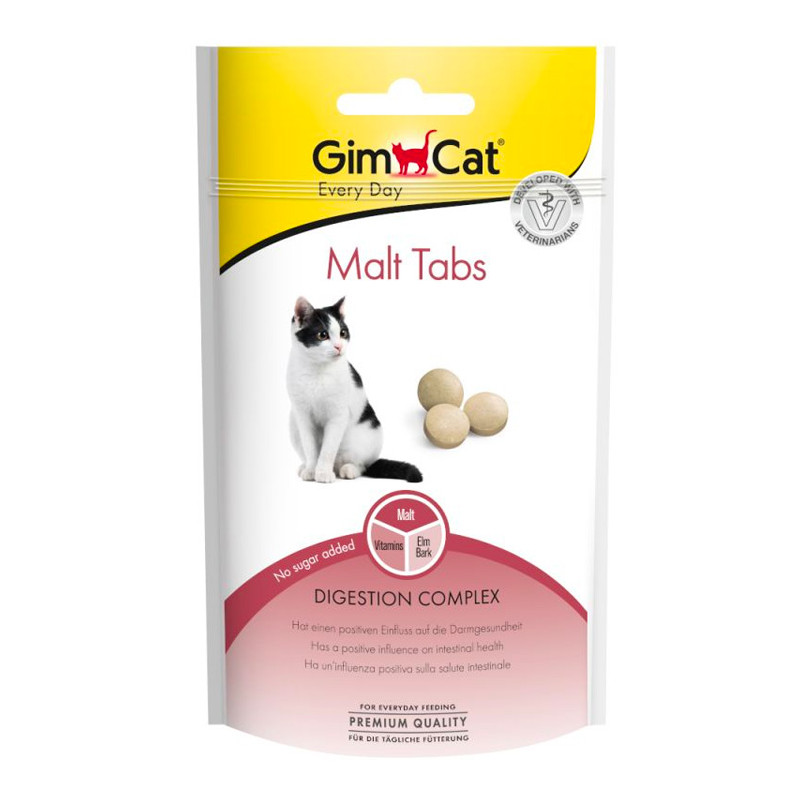 GimCat Malt Tabs zawiera aromatyczny ekstrakt słodowy, korę wiązu i ważny błonnik pokarmowy. GimCat Malt Tabs wspomaga transport pożywienia do organizmu, przyspieszając wydalanie włosów i innych ciężkostrawnych elementów i rozwiązując problem tworzenia się kłaczków w przewodzie pokarmowym.