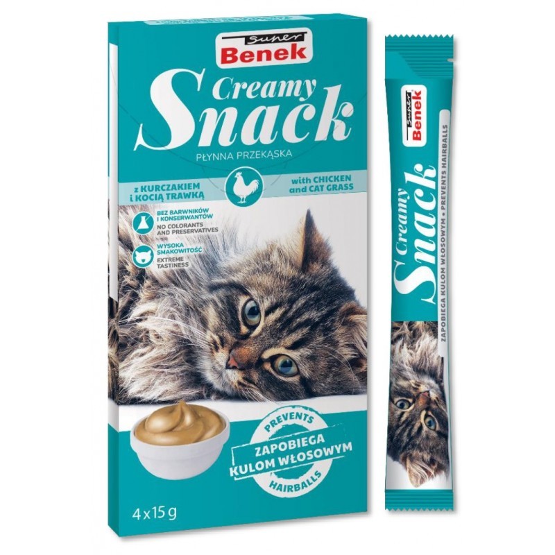 Zadbaj o zdrowie i przyjemność swojego kota dzięki SUPER BENEK Creamy Snack z kurczakiem i kocią trawką ! Ta pyszna i lekkostrawna przekąska nie tylko rozpieszcza kocie podniebienie, ale także wspiera trawienie i zapobiega powstawaniu kul włosowych.