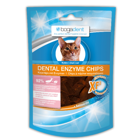 Bogadent Dental Enzyme Chips to pyszne chipsy dentystyczne wykonane w 92% z ryb i kurczaka. Funkcjonalnie uzupełnione innowacyjną formułą XF3 -Efekt, wykonaną z naturalnych enzymów ze skoncentrowanej serwatki i dwoma dodatkowymi aktywnymi składnikami (ekstrakt z owoców CB90MX, minerały), chipsy łączą codzienną opiekę stomatologiczną z nagrodą. Specjalna konsystencja smakowitych Dental Enzyme Chips powoduje również czyszczenie zębów podczas żucia.