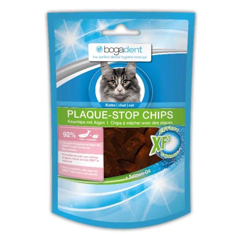 Bogadent Plaque-Stop Chips to przepyszne chipsy do pielęgnacji zębów składające się w 87% z mięsa. Są one wzbogacone w innowacyjną formułę XF3-Effect z enzymami ze specjalnej mieszanki glonów i z 2 substancjami czynnymi (ekstraktem z owoców CB90MX i minerałami), łącząc w sobie codzienną pielęgnację zębów z funkcją nagrody. Specjalna konsystencja smacznych chipsów Plaque-Stop ułatwia czyszczenie zębów podczas gryzienia.