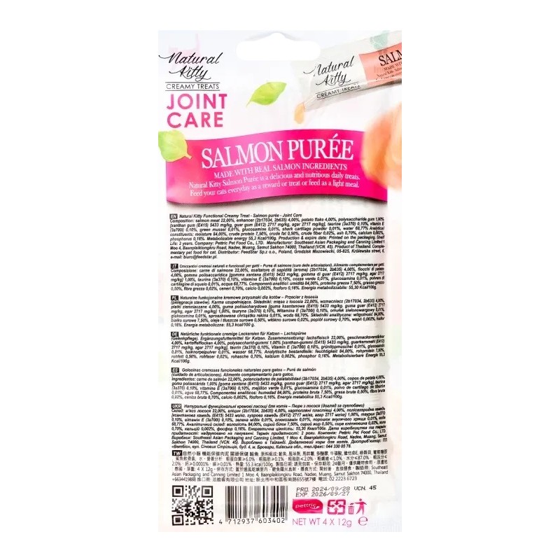 Skład: Mięso z łososia 22,00%, wzmacniacz (2b17034, 2b635) 4,00%, płatki ziemniaczane 4,00%, guma polisacharydowa [guma ksantanowa (E415) 5433 mg/kg. guma guar (E412) 2717 mg/kg, agar 2717 mg/kg] 1,00%, tauryna (3a370) 0,10%, Witamina E (3a700i) 0,10%, omułek zielonowargowy 0,01%, glukozamina 0,01%, sproszkowana chrząstka rekina 0,01%, woda 68,70%.