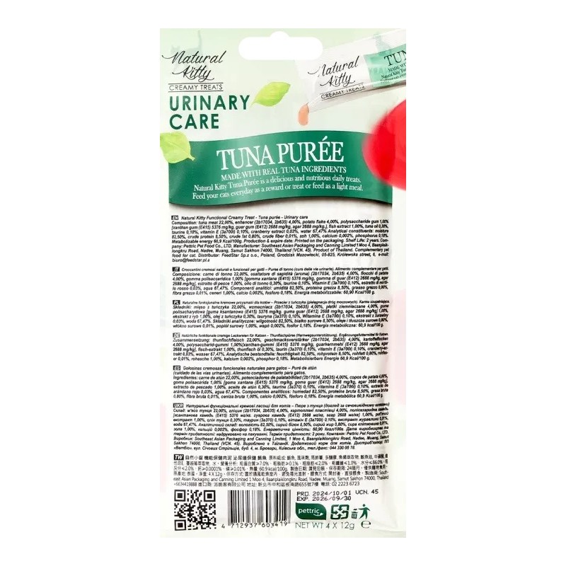 Skład: Mięso z tuńczyka 22,00%, wzmacniacz (2b17034, 2b635) 4,00%, płatki ziemniaczane 4,00%, guma polisacharydowa [guma ksantanowa (E415) 5376 mg/kg. guma guar (E412) 2688 mg/kg, agar 2688 mg/kg] 1,00%, ekstrakt z ryb 1,00%, olej z tuńczyka 0,30%, tauryna (3a370) 0,10%, Witamina E (3a700i) 0,10%, ekstrakt z żurawiny 0,03%, woda 67,47%.