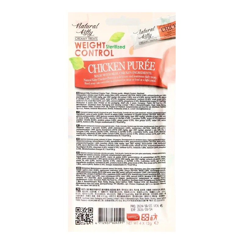 Funkcjonalne kremowe pałeczki z kurczaka do kontroli wagi u kotów po sterylizacji. Wzbogacone w wielonienasycone tłuszcze, L-karnitynę i witaminę E, poprawiają kondycję sierści, wspierają zdrowie serca i przyczyniają się do ogólnego dobrostanu kotów sterylizowanych oraz starszych.