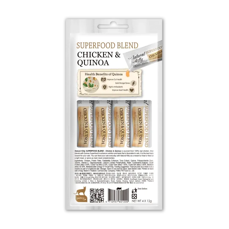 Skład: Kurczak, komosa ryżowa, woda, modyfikowana skrobia z tapioki, wzmacniacz smaku, białko grochu, ekstrakt z tuńczyka, guma guar, tauryna, fruktooligosacharyd, Witamina E, olej z tuńczyka.