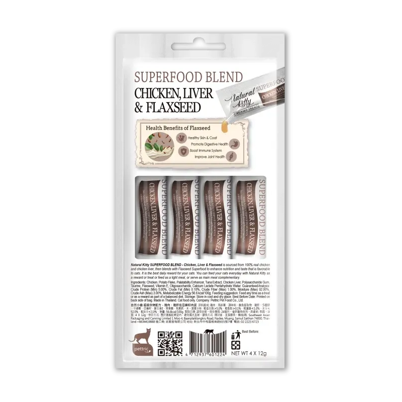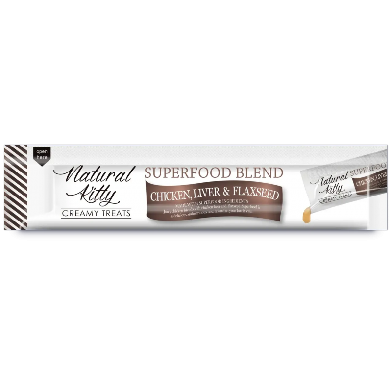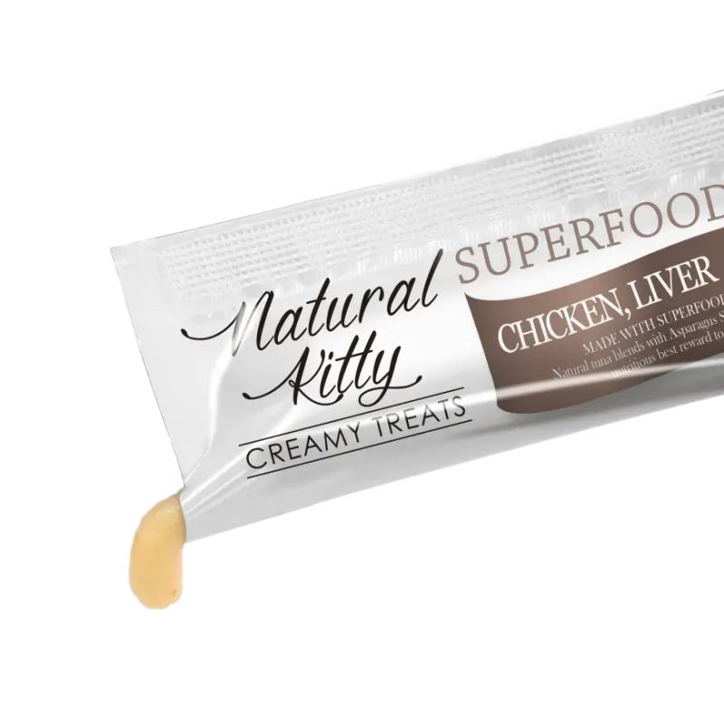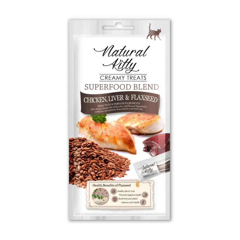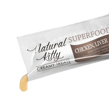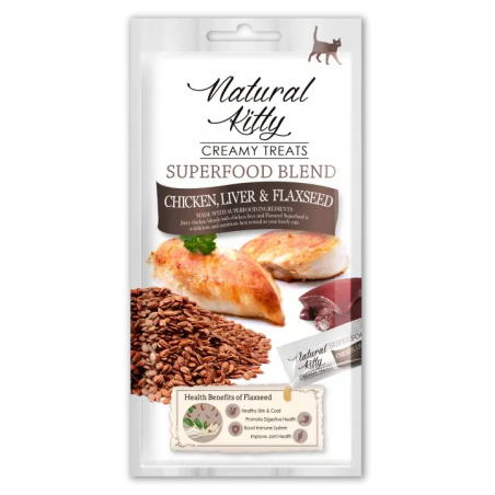 Przysmak Natural Kitty Creamy Treats to idealna przekąska dla waszego kota. Przysmak zrobiony jest z kurczaka z wątróbką z dodatkiem siemienia lnianego, który wspiera metabolizm waszego pupila. Dodatkowo wspiera układ immunologiczny i poprawia stan skóry i sierści. Ta zdrowa przekąska ma mnóstwo witamin, minerałów i antyoksydantów.