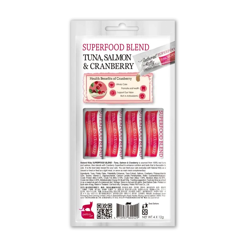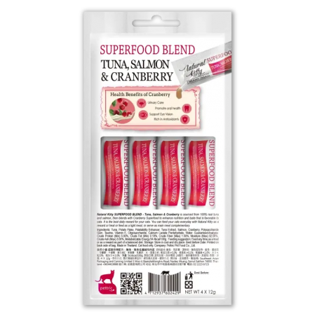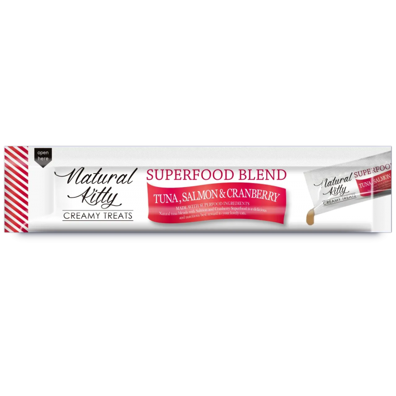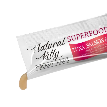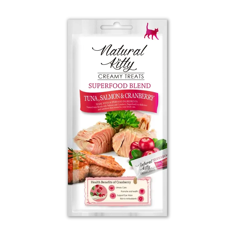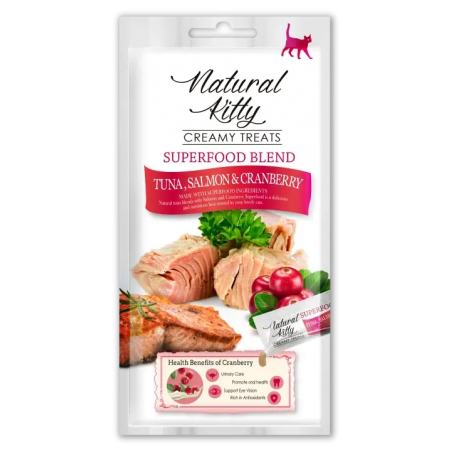 Przysmak Natural Kitty Creamy Treats to idealna przekąska dla waszego kota. Przysmak zrobiony jest z tuńczyka z łososiem z dodatkiem żurawiny. Dodatkowo wspiera układ immunologiczny i poprawia stan skóry i sierści. Ta zdrowa przekąska ma mnóstwo witamin, minerałów i antyoksydantów.